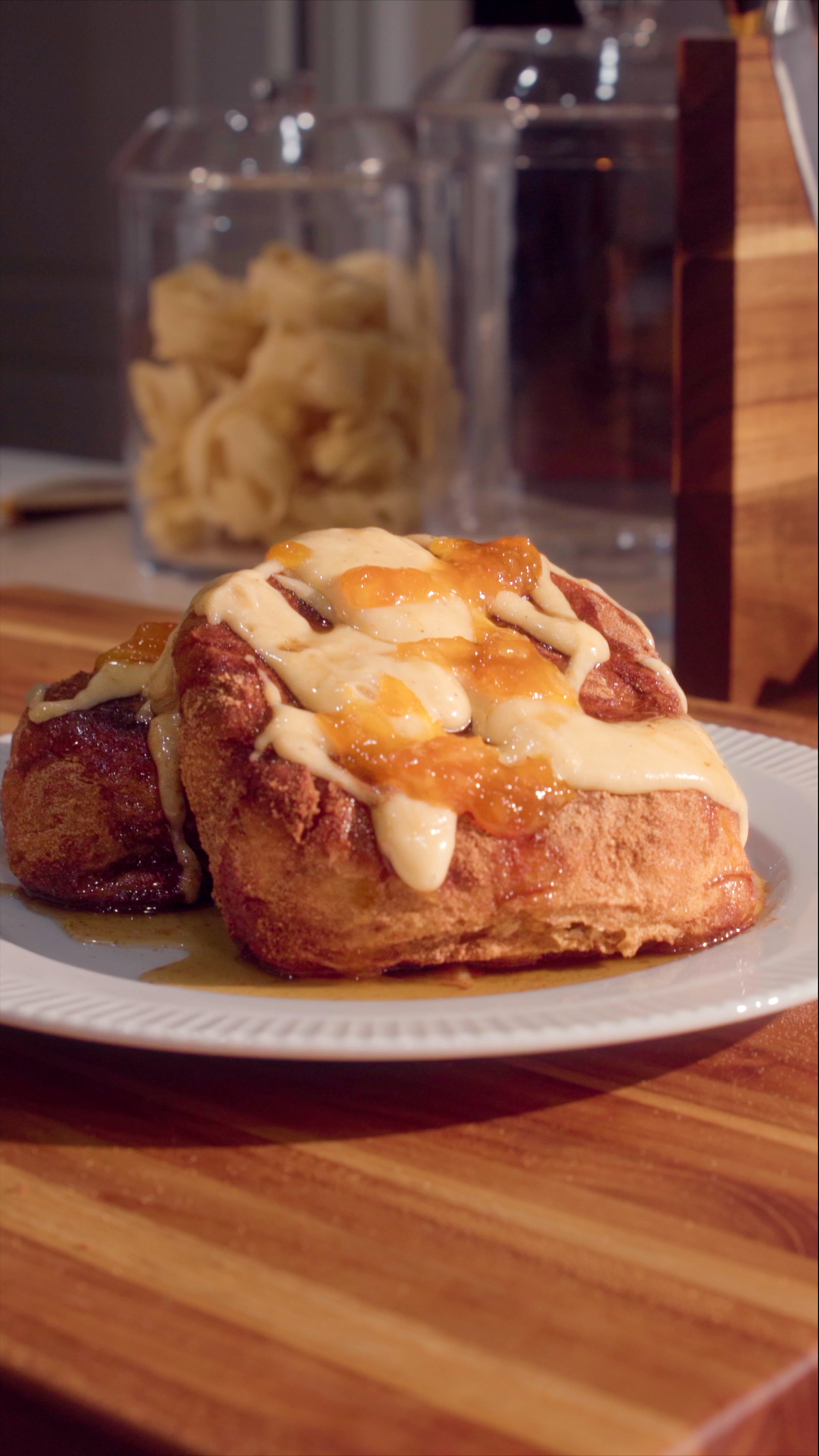 Plate the cinnamon French toast, drizzle the icing on top, add a bit of extra orange marmalade, and cover in some quality maple syrup.